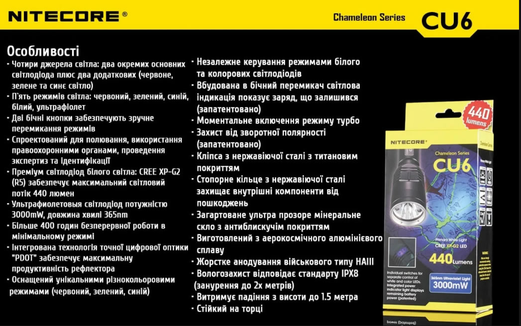 Ліхтар Nitecore CU6 (Cree XP-G2 R5 + ultraviolet LED, 440 люмен, 13 режимів, 1×18650)
