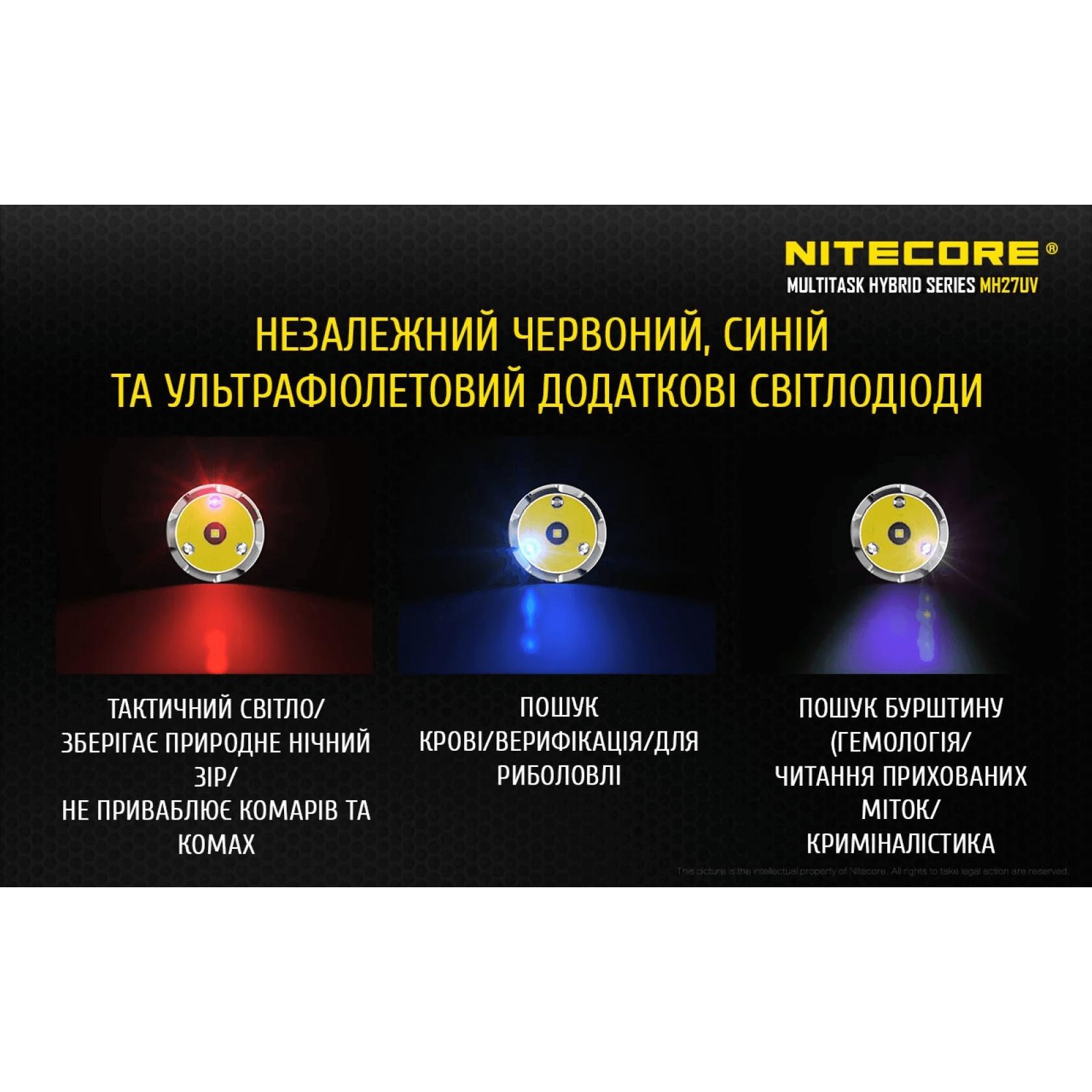 Представлена модель ліхтаря володіє збільшеним набором фукнкцій в які входить ультрафіолетовий світлодіод – це ліхтар Nitecore MH27UV. Головними відмінностями між ліхтарями є, то що MH27UV оснащений додатковим світлодіодом, який розташований біля основного джерела світла – це високопродуктивний ультрафіолетовий світлодіод з хвилею випромінювання в 365nm. У порівнянні з моделлю MH27, замість ультрафіолетового світлодіода встановлений світлодіод синього світла. Модель оснащена чудовим по продуктивності світлодіодом американського виробництва CREE XP-L HI V3, який виробляє світловий потік в 1000 люмен.