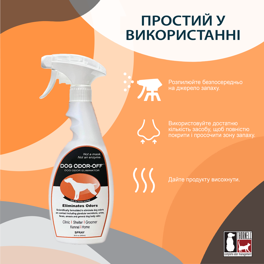Рідина для видалення запаху собаки ODORCIDE® Dog Odor-Off Spray відмінний продукт для цуценят і не молодих собак, яким складно вчасно вийти на вулицю. Засіб для усунення запаху, схвалене ветеринарами, миттєво видаляє запах сечі собаки. Очищає й дезодорує килими, килимки або підлогу з твердих порід дерева, шкіру, оббивку та інші поверхні. Неферментативная формула безпечна для домашніх тварин і людей.
