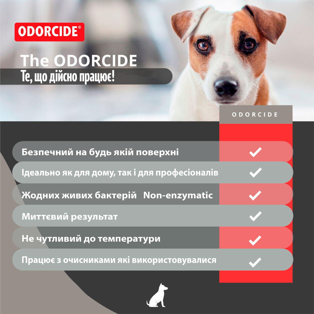 Вся продукція Odorcide є безпечною для використання на будь-якій поверхні. Дотримуйтесь вказівок на етикетці. Зберігати у недоступному для дітей місці. Тільки для зовнішнього застосування. Уникайте замерзання продукції.