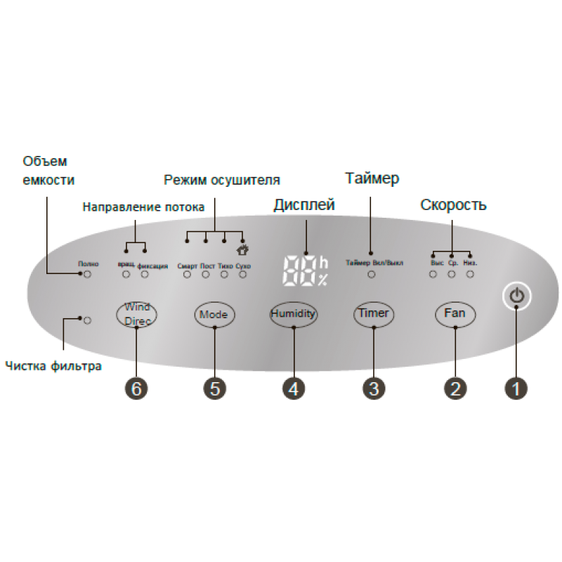 • индикация состояний, режимов, уровней влажности (текущей и заданной), скорости вентилятора (высокой, средней или низкой), авторазморозки, очистки фильтра, наполнения бака и др.;
